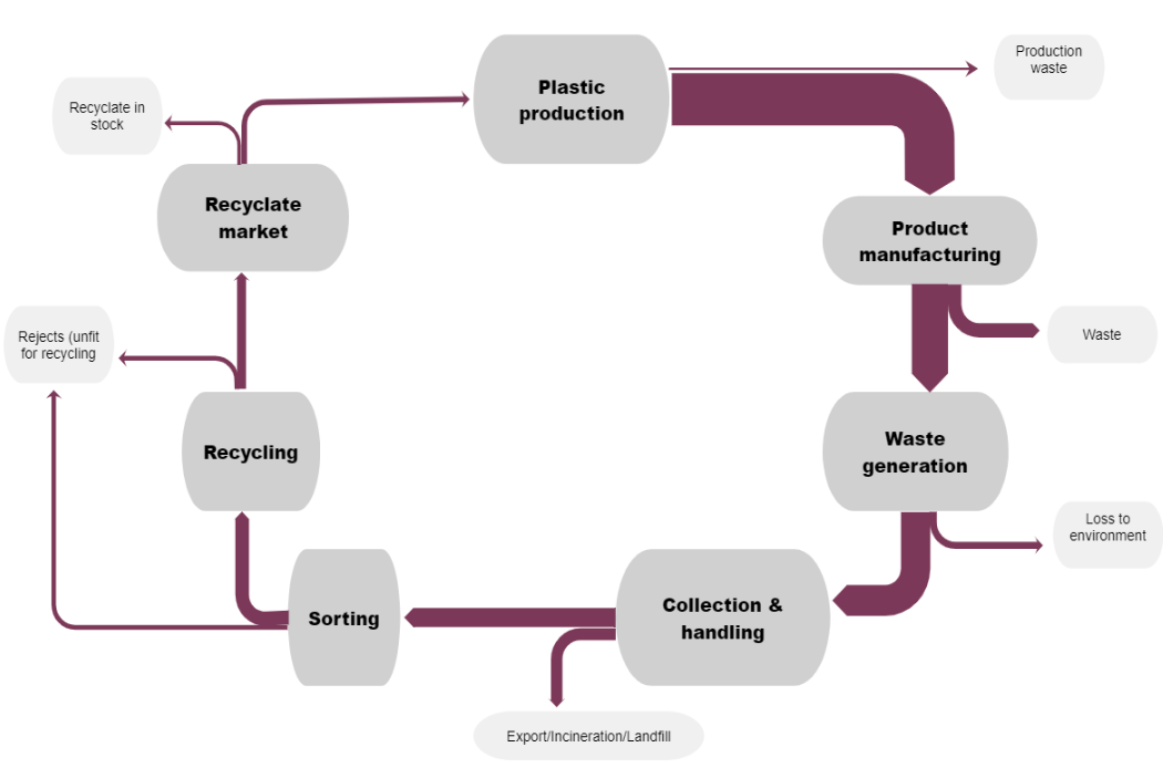 The various stages include primary plastic production, product manufacturing, product consumption, plastic waste collection, sorting, and recycling (Olatayo et al., 2023)*. Making informed decisions relating to resource efficiency and optimisation, waste reduction, and environmental sustainability is crucial, andclosely tied to a good knowledge of the value chain.